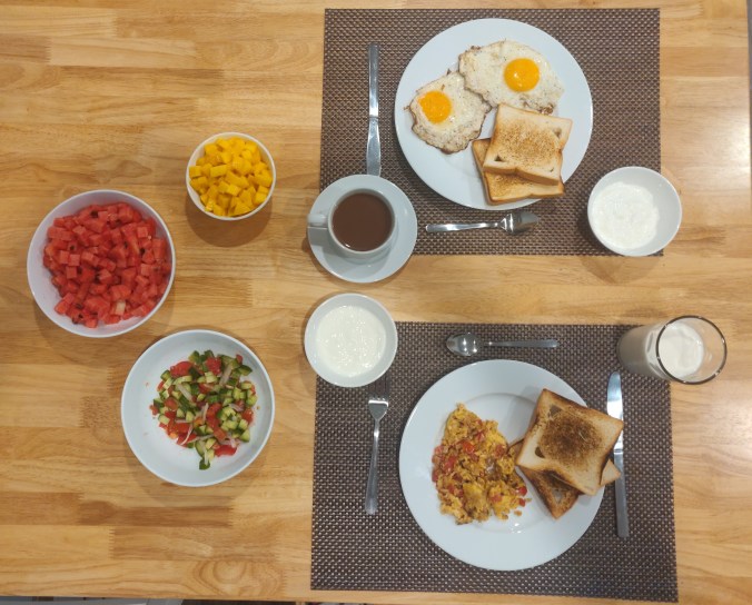 ‘s Morgens wordt er luxeontbijt voorzien. De ene keer door Ann-Sofie, de andere keer door Nick. Voor de nieuwsgierigen: een berg toast in een pan met boter gebakken, spiegeleitjes, vers fruit met yoghurt, een Grieks slaatje en een heerlijke tas chocomelk. Meer moet dat niet zijn.