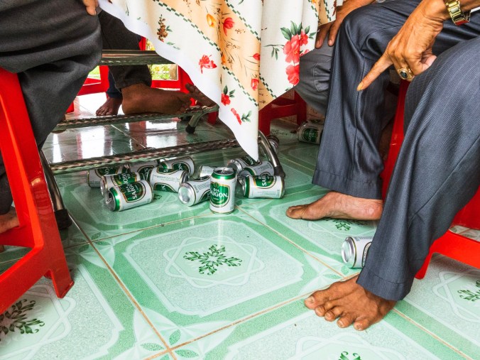 Vanaf de eerste Mo Hai Ba Dzo (toasten op z’n Vietnamees, zie de post van de Ha Giang motorloop) hebben ze door dat we dit nog al gedaan hebben, en dus zetten we de volgende zelf in. Het eten is overheerlijk, en bijvullen hoeven we al helemaal niet zelf te doen. Van zodra er wat ruimte vrijkomt in een van onze kommen ligt er al iets nieuws in de plaats. Het aanbod is enorm groot, van gewokte groentjes, noedels, rijst en kip tot zelfs lever en vette derms. Tegen dat we van alles eens geproefd hebben zitten we best al vol. Dit kan natuurlijk ook komen omdat er om de 2 minuten getoast wordt met een glas warme Bia Saigon met ijsblokken, per slok begint er wel iemand met het inzetten van de Mo Hai Ba Dzo. Er lijkt ook een soort 1-on-1 toast te bestaan, waarbij iemand toast met iemand anders, en beiden het glas leeg moeten drinken. Er passeren dus veel blikjes Bia Saigon, en telkens er eentje leeg is wordt het simpelweg onder tafel gegooid, het opruimen is duidelijk een zorg voor later. Niemand van de bende spreekt een woord Engels, maar in gebaren taal en met google translate slagen we er in grootse conversaties te voeren. Wanneer ze na 2 uur tafelen dan eindelijk door hebben dat we genoeg gegeten hebben, wordt het dessert op tafel getoverd. Een berg lychees, vers geplukt uit de tuin. Twee keer raden wie die berg zowat in zijn eentje verzet heeft… Nick natuurlijk. Ann-Sofie ontfermt zich dan maar met veel plezier over het lokale dessert in bananenbladeren. Heerlijk.