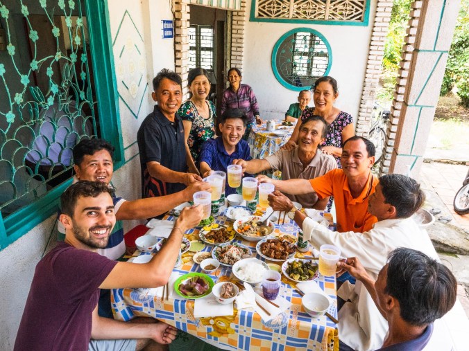 Met hernieuwde energie zoeven we van het ene straatje naar het andere. Onderweg passeren we een hele zwerm enthousiast zwaaiende schoolkinderen in uniform, en houden de lokale honden ons gezelschap tijdens het fietsen. Wanneer we op de rivier stoten, die An Binh van Vinh Long scheidt, beginnen we stilaan honger te krijgen. Een probleem, want ook hier is er nergens leven te bespeuren, laat staan een lokale eettent. We besluiten gewoon door te rijden op goed geluk en te zien wat we onderweg tegenkomen, terugkeren is al helemaal uit den boze want we weten dat er in het eerste half uur fietsen niets is. Een kwartiertje later passeren we een huis waar zowat 15 locals aan het eten zijn, en vermoeden dat dit misschien wel een lokale eettent zou kunnen zijn. Wanneer we met gebarentaal vragen of we er kunnen eten reageren ze allemaal super enthousiast en doen ze teken dat we binnen mogen komen. Nog geen seconde later bevinden we ons al tussen de enthousiaste Vietnameesjes, die verrassend genoeg allemaal hetzelfde aan het eten zijn. Toeval of niet? We beseffen al snel dat dit helemaal geen eettent is, maar een terras van een huis waar toevallig een hele bende aan het lunchen is. Nog voor we dit goed en wel beseffen staan er al 2 extra kommetjes op tafel, zijn er stoelen bij gezet en worden de stokjes in onze handen geduwd. De ene kapt een warme Bia Saigon in een beker met ijs terwijl een ander stukjes vlees en groenten in onze kommetjes legt. We hebben zelfs de kans niet om dit misverstand uit te leggen, want ze zijn allemaal super enthousiast met ons onverwachts bezoek.