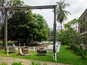Buiten zien we een houten constructie die, toen dit nog een schooltje was, diende om sportoefeningen op uit te voeren. Kinderen klimden langs de palen omhoog om zich dan op te trekken. Tijdens de Tuol Sleng periode was het gebruik echter heel wat gruwelijker, en diende ze als folterwerktuig. Slachtoffers werden aan hun armen omhoog gehesen en uren lang geslaan, tot ze bewusteloos vielen van de pijn of de uitbering. Van zodra dat gebeurde werden ze naar beneden gehaald en werd hun hoofd in een vat met pesticiden ondergedompeld, waardoor ze door shock meteen weer bij bewustzijn kwamen. Ze werden verder ondervraagd om daarna weer omhoog gehesen te worden.