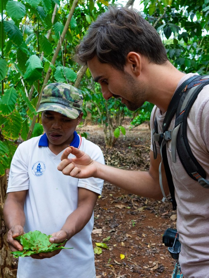 En half uur later staan we klaar om een rondleiding te krijgen in de koffieplantage van Mr. Vieng. Hij is aangeraden door Yves (van Miss Noy, nvdr.) omdat hij een authentieke plantage runt, waarbij er nog geen grootschaligheid aan te pas komt. Na het drinken van een ice coffee – die geen van ons lekker vindt want koffie heeft ons nog nooit echt gesmaakt – begint de rondleiding in een kleine groep van 5 man. Hij toont ons een plantage die eerder iets weg heeft van een willekeurig aangelegde tuin dan van een echte plantage. De soorten koffie staan door elkaar, afgewisseld met chili en bananbomen. Hij toont ons hoe peanuts worden gekweekt en hoe simpel het groeien van maniok wel niet is. Z’n dochtertje volgt ons op de voet, en staat bijna op het punt te knabbelen aan een verse chilipeper, gelukkig is papa Vieng net op tijd om haar tegen te houden.
