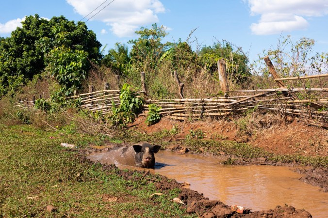 met een biggetje, een waterbuffel, een koe, een varken, een hond en een kip.