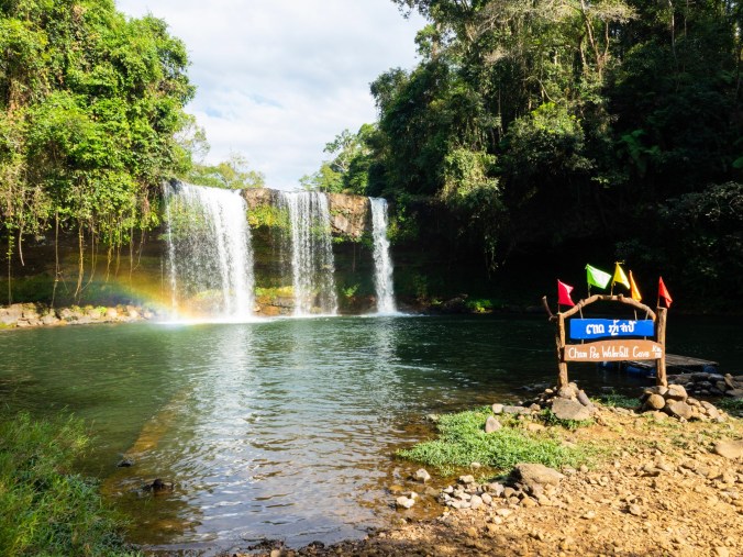 ‘S ochtends gaan we na het ontbijt nog snel 4G fixen voor onze SIM kaart, maar het winkeltje waar we de kaart gisteren gekocht hebben blijkt gesloten te zijn. Na wat rondzoeken geven we het op en gaan we ontbijten, en merken we dat het ondertussen al bijna 9u is. De afspraak met Pauline kunnen we dus onmogelijk nog halen. We laten het haar weten en spreken een kwartiertje later af. Tegen 9u15 zijn we er wel, droppen we onze rugzakken en krijgen we elk een brommer toegewezen. De eerste stop is een tankstation, want zoals we ondertussen al wel weten is de benzinegewoonte van brommerverhuurders in Azië leeg-leeg, en niet de vol-vol zoals overal elders in de wereld. We rijden nog even rechtdoor het centrum uit, en na een eerste afslag is de loop echt begonnen. Het landschap is meteen al een stuk verlatener en we hebben al helemaal geen stadsgevoel meer. We bollen rustig door, want we hebben best wel genoeg tijd vandaag en komen aan bij Tad Pasuam, de eerste waterval van de loop. Na het betalen van een toegangsticketje voor ons en onze brommers mogen we binnen.
