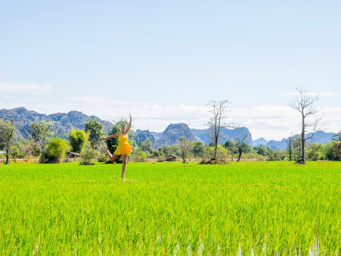 De tocht zetten we verder richting de Buddha cave, het padje er naartoe is leuk om te rijden, vrachtwagenloos en in een mooie omgeving, maar de cave zelf lijkt ons niet de moeite dus besluiten we deze te skippen. Dan is het de beurt aan Tha Falang, maar voor we daar aankomen zien we eindelijk in levende lijve groene rijstvelden. Ann-Sofie is in de zevende hemel, want deze keer kunnen we er wel stoppen, in tegenstelling tot de velden tijdens de busrit.
