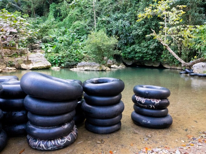 Dan terug naar de Water Cave, en ondertussen is het al heel wat rustiger en kunnen we zelfs in ons eentje de cave in. We wisselen naar onze zwemoutfit en krijgen elk een camionband toegewezen. De eerste aanraking met het ijskoude water is wat minder, wat wordt beaamt door lichaamsdelen die best wat minder plek innemen dan voor deze onprettige kennismaking. We trekken onszelf de grot in via een koord, en gaan op verkenning. Pikdonker en ijskoud, een aparte ervaring. Wel plezant om hier helemaal alleen in te zijn, in alle rust. Na een korte toer keren we terug naar buiten, waar we snel weer wisselen in een iets warmere outfit. De fietstocht richting Vang Vieng wacht ons nog, dus warmen we ons snel even op en springen we terug op onze tweewieler. De weg lijkt naar beneden te lopen, geen wonder dat het daarnet zo traag vooruit ging. Of het is dat, of we hebben gewoon honger en verlangen naar een rustig plekje om te zitten, waardoor we ongekende energiebronnen kunnen benutten.