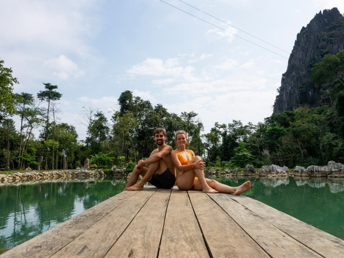 De volgende dag is het Blue Lagoon Loop, waarbij we in een dag maar liefst 3 Blue Lagoons zullen bezoeken. We hebben ondertussen beslist de ballonvaart te doen, en nemen tijdens het ontbijt contact op met het bedrijf dat dit organiseert. Het blijkt nog maar een goeie maand geleden opgestart te zijn, en is volledig gerund door Laotianen, wat ons een warm gevoel heeft. De andere luchtballonnen (die boven de stad vliegen) worden uitgebaat door Chinezen, en dat steunen we liever niet te veel. Eén van de organisatoren komt speciaal voor ons af naar het restaurant en we bespreken de mogelijkheden. Het is een enorm sympathieke gast, met perfect Engels, wat een leuk gevoel heeft om zo de eerste keer een ballonvaart mee te doen. Het gesprek is heel los en spontaan, zalig om zo iets te kunnen regelen. Hij vertelt ons over de verschillende pakketten die ze aanbieden (wat er uiteindelijk maar 1 blijkt te zijn) en hoe alles zal verlopen. We spreken morgenochtend af om 5u voor de pickup, en met een klein voorschot (waarvan niets op papier hoeft te staan, iets wat we anders nooit zouden doen, maar dit voelt echt goed aan) is alles geregeld. Daarna starten we de lagoon loop in omgekeerde richting dan de tours ze doen om de meute wat te vermijden en dat lijkt te werken. Langs de weg rijden geen busjes of tuk tuks, enkel locals met hun brommers. De verharde weg wordt al snel ingewisseld voor grind en stof, en dus is het weer uitkijken geblazen om wat comfortabel te kunnen fietsen. Het is dan nog eens warm ook, dus het vergt best een hele inspanning om de kilometers erdoor te jagen. De eerste Blue Lagoon is op ongeveer 12 kilometer verwijderd, best een heuse afstand in deze omstandigheden. Maar tegen alle verwachtingen in geraken we er goed en wel, en worden we beloond met een heerlijke duik in verfrissend water, waarbij we duidelijk weer de eerste zijn die hier toekomen. De Lagoon is volledig leeg, en dus maken we ervan gebruik om eens rustig te zwemmen. Er staat ook een duikplank opgesteld, waar we beiden gretig gebruik van maken. Vanop een hoogte van zowat 6 meter springen we het helderblauwe water in, simpelweg prachtig!