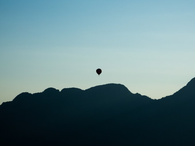 Na al die kilometers op de fiets nog dit viewpoint opklimmen lijkt ons gekkenwerk, en dus nemen we er onze tijd voor. Ondanks dit feit komen we best nog binnen een respectabele tijd van 50 minuten aan, 10 minuten sneller dan de aanbeveling! Het zicht is werkelijk fenomenaal: karstrotsen rondom een prachtige vallei, waarin mini-mensjes trachten zich zo snel mogelijk te verplaatsen, wat van hieruit echt belachelijk traag lijkt te gaan. We wachten er geduldig de sunset af, wat rustig begint met een lichte oranje schijn en al snel overgaat in een prachtig kleurenspel. Ondertussen zijn er weer verschillende luchtballonnen in de lucht te zien. Morgenochtend is het onze beurt!