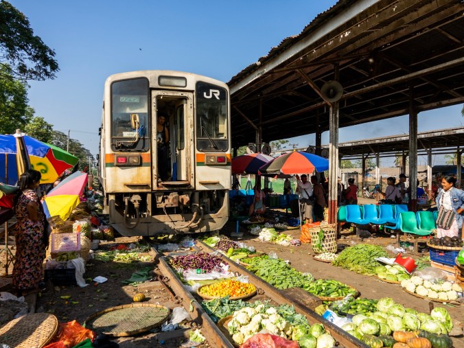 De Da Nyin Gone markt is een treinmarkt, in de letterlijke zin van het woord. Goederen worden tentoongesteld langs en tussen de sporen door, terwijl iedereen erlangs loopt om z’n inkopen te doen. Eens we dicht genoeg naderen begint de trein te toeteren en zien we hoe in een mum van tijd al de parasols van de sporen verdwijnen, mensen aan de kant gaan staan en de markt eventjes op pauze wordt gezet. De trein rijdt los over de sla en tomaten heen, reizigers stappen tussen de groenten en fruit op en van de trein en vervolgens rijdt hij weer verder. Wij zijn ook afgestapt, en zien tot onze verwondering hoe de parasols binnen de 10 seconden nadat de trein is gepasseerd, al terug op hun originele plaats staan. Verkopers nemen hun plaatsen terug in, en de markt herneemt z’n gewone gang, alsof er niets gebeurde. Dat de groenten onder de trein bespetterd kunnen worden met olie en vuil van onderaan de trein, of dat er nu en dan wat meegesleurd wordt door een inschattingsfout van de verkoper hoort er nu eenmaal bij.