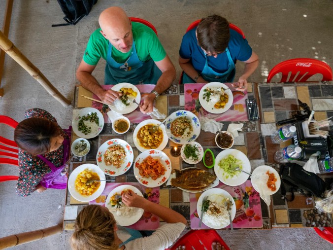 Nu de hoofdgerechten af zijn is het tijd voor het middagmaal, de tafel staat opnieuw compleet overhoop met alle heerlijke opties die we zonet hebben gemaakt. De curry’s en salads die iedereen heeft gemaakt gaan in ieder geval meer dan genoeg zijn voor ons 5. Er volgt meteen ook een gezellige babbel, we leren ZuZu wat beter kennen en praten met de Fransen over de heerlijke kaas die we toch wel wat missen. ZuZu is een paar jaar geleden blijkbaar uitgenodigd door een Nederlands koppel om een paar maand bij hen in te wonen en Engels te leren. Ze heeft op die manier een perfect idee hoe het er bij ons aan toe gaat, wat wij lekker vinden en wat onze gewoontes zijn. Die uitnodiging heeft ervoor gezorgd dat ze nu kan doen wat ze doet, en ze is hen dan ook uiterst dankbaar. Wij luisteren met open oren en ogen naar dit verhaal, hoe inspirerend! Een prachtig initiatief dat een direct resultaat oplevert voor iemand hier, als dat geen manier is om iemand te helpen. En het is meer dan 1 iemand die ermee gediend is, door deze cooking class kan ze haar hele familie onderhouden. Dankzij twee openhartige Nederlanders zijn er hier een hele hoop mensen een stuk gelukkiger, als dat geen mooi gebaar is. Ook vertelt ze over Sinterklaas en de Kerstman, hoe die cadeautjes uitdelen en ze niet kan geloven dat zij er ook heeft gekregen. De Kerstman is zelfs speciaal voor haar vroeger naar Nederland gekomen omdat ze midden december al terugkeerde naar Myanmar, en ze die anders ging moeten missen, wat een sympathieke man toch!
