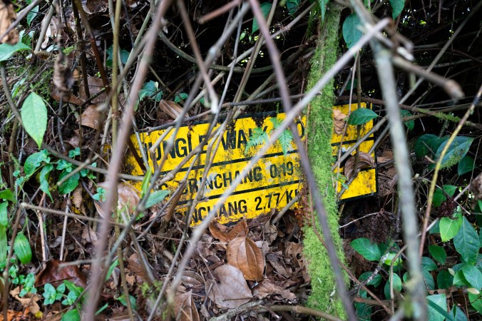 We hebben het ondertussen helemaal uitgedokterd. Om het echte stuk Mossy Forest te bereiken, en dus niet het gedeelte van de boardwalk, dienen we een aantal trukken toe te passen. Eerst en vooral moeten we een pad volgen dat eigenlijk officieel gesloten is (maar er is nergens een verbodsbord te zien, dus weten we van niets natuurlijk), en daarna moeten we ongezien door een terrein lopen waar we eigenlijk niet horen te komen. Of we daar eerst en vooral al gaan geraken is nog maar de vraag, want jungle trail 1 vinden blijkt niet zo eenvoudig te zijn. De ingang is een paar jaar geleden door een landslide weggespoeld, en dus moeten we vertrouwen op wat we online lezen, waarbij er een aantal suggesties staan met een mogelijke route die op pad 1 zou uitkomen. We trekken vroeg genoeg op pad en vermijden ditmaal gelukkig de file, en kunnen dus snel beginnen aan de zoektocht. Na het rechts houden op de eerste splitsing en een ‘trap’ op te kruipen die het bos in loopt lijken we de goeie richting uit te gaan, wat aangeduid wordt door lintjes die aan de bomen langs het pad hangen. De eerste zijn wit, wat geen officiële route aanduidt, maar iets later veranderen ze in roze, de oorspronkelijke aanduiding van trail 1, het is ons gelukt!