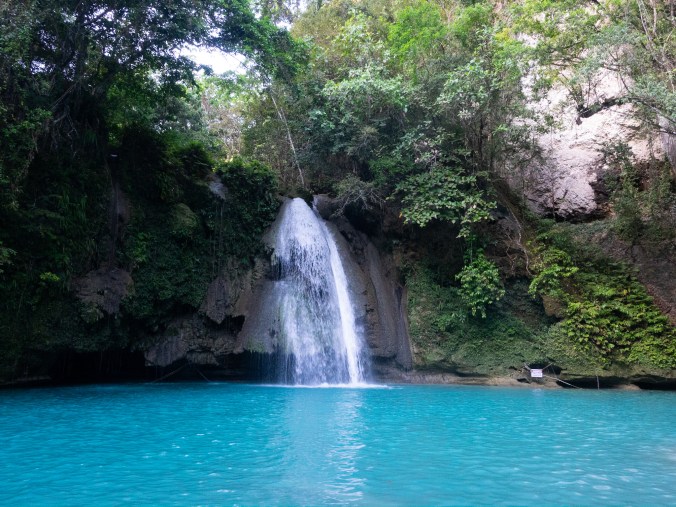 Op Pasen weten we wat te doen, de Kawasan Falls die tot onze verwondering wel open zijn vandaag. We dachten de eersten te zijn tegen 7u, maar dat is verre van het geval. Na een stevige wandeling van de inkom naar de eigenlijke watervallen – bijna een kilometer gaan – en inkom te betalen, zien we al paraplu’s en picknicktafels opgesteld staan. Normaal gezien is er ‘s morgens bijna niemand, maar door onze prachtige Pasen-timing komt er naar het schijnt een 1000 man op af, we hebben het weer gekund. De Filippinos liggen al met z’n alles te dobberen in hun zwemvesten en dus wandelen we even door, ook hier zijn weer verschillende niveaus te vinden. Bovenaan is het nog lekker rustig, en met een slinger en rotsglijbaan kunnen we ons wel amuseren. Een locker huren kost evenveel als de volledige inkom van het park, en de bovenste plaat ligt trouwens los, en wanneer Ann-Sofie die omhoog tilt, zegt ze doodleuk dat we hier niet voor betalen. We vertrouwen dan maar op de Filippijnse eerlijkheid en laten alles gewoon op een bank liggen. De eerste slingerpoging van Nick is niet echt plezant wanneer hij los op z’n rug in het water valt bij het proberen van een salto. Geen salto’s meer dus, dat is duidelijk. Na een tiental sprongen komt er plots een man toegelopen die ons weet te zeggen dat de liaan 100 Pesos per slinger kost. Jawel, je betaalt per slingerbeurt, niet per persoon. Doei, dat hoeft voor ons niet.