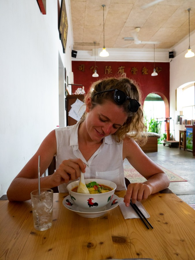 Als afsluiter van Georgetown gaan we nog één maal lekker eten in het restaurantje van de eerste dag, een curry die verdomd dicht in de buurt komt van de Thaise en Laotiaanse curry’s, en een lokaal noedel soepje dat Ann-Sofie heerlijk smaakt. En dan is het tijd om door te gaan, we willen de ferry vroeg genoeg halen om zo op tijd te zijn voor het kopen van een ticketje voor de bus, een ticket online boeken lukt namelijk niet. Hopend op 2 vrije plekken halen we mooi de ferry van 19u, waarna we uiteindelijk nog heel wat tijd over hebben, de bus is nog niet eens half volboekt. We gebruiken de 2 uur wachten om een powernap te doen en wat verder onderzoek te verrichten naar de Perhentian Islands. De bus dient als overnachting, ook al gaan we tegen 3u ‘s morgens waarschijnlijk gedropt worden, lekker vroeg!