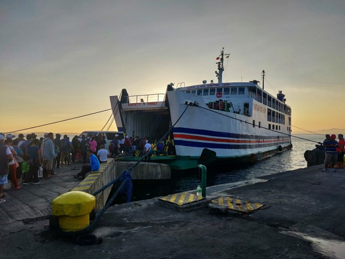 Nu en dan stopt de bus voor een plaspauze of om mensen langs de kant te laten opstappen, en langzaam maar zeker komt de bus vol te zitten. Helaas moeten we dus terugkeren naar onze voorziene plaatsen, en onze benen in onze nek leggen. De pauzes zijn dus meer dan welkom. Het duurt ongeveer 11u vooraleer we het noorden van Leyte bereiken, maar dan zijn we er nog lang niet. Hier moet de bus, en iedereen er op, ingeladen worden in een ferry die ons van Leyte naar Luzon brengt. Luzon is de eilandengroep waar ook de hoofdstad Manila op gevestigd is, en waarop Legazpi, de eindbestemming van deze busrit ligt. Er is wat onduidelijkheid in de ferry terminal want iedereen moet uitstappen en naar het loket gaan om een ticket te kopen, maar dat zou in de prijs moeten zitten. Onze mede busgenootjes betalen allemaal gewoon de terminal fee, en lopen dan weer naar buiten, waarbij wij hen als schoothondjes op de voet volgen. Terug aan de bus krijgen we onze ferry tickets, waarna we opnieuw naar de terminal moeten gaan om daar binnen te wachten… Een organisatie waar wij niet wijs uit geraken. En dan is het wachten tot onze bus afgeroepen wordt. Nadat we even wanhopig rondkijken om uit te vissen hoe dit precies verloopt (de mededelingen over de luidsprekers zijn enkel in het Filippijns), doet een collega busreiziger teken dat zij wel zal zeggen wanneer we moeten opstaan, dankuwel! Eens de melding komt, kunnen we allemaal samen opstappen en duurt het nog anderhalf uur vooraleer de ferry ingeladen is en we kunnen vertrekken.